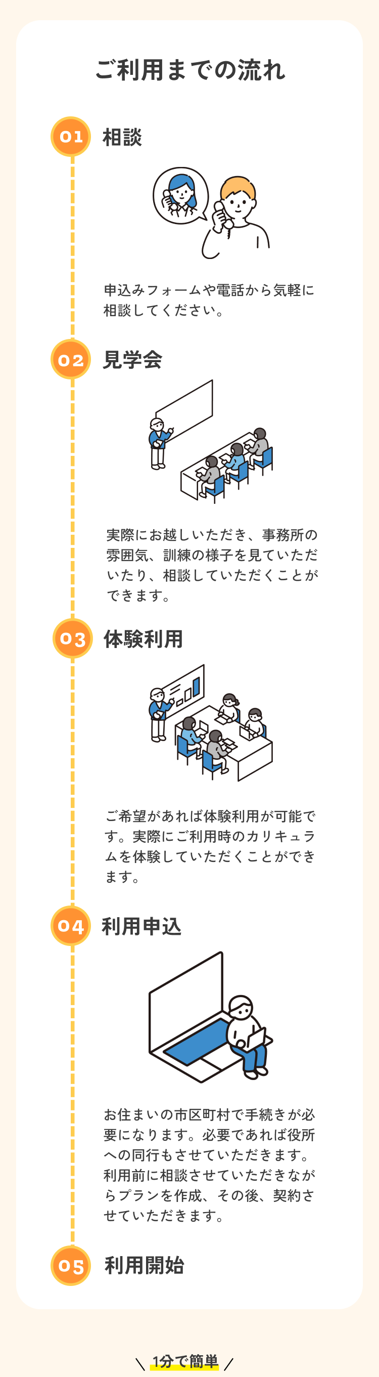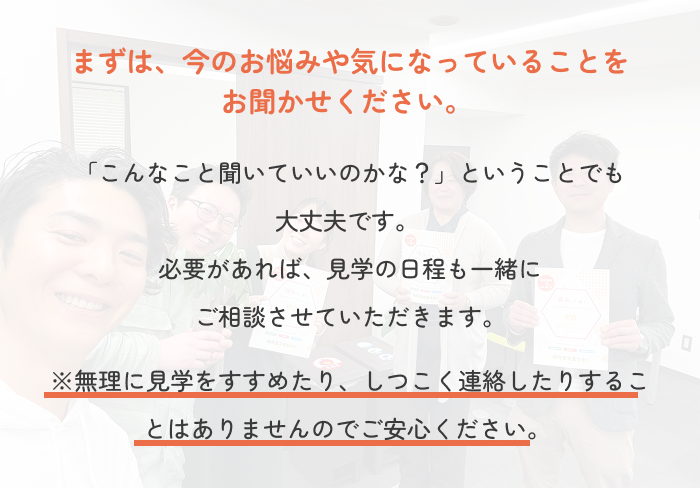 いただいたお問い合わせには、翌営業日までにご返答いたします。※ご相談・見学・体験は全て無料ですので、お気軽にお申し込みください。